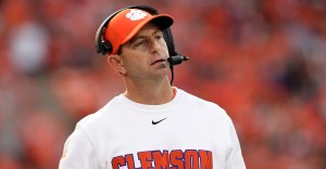 CLEMSON, SC - NOVEMBER 12: Head Coach Dabo Swinney of the Clemson Tigers reacts after a play during the game against the Pittsburgh Panthers at Memorial Stadium on November 12, 2016 in Clemson, South Carolina. (Photo by Tyler Smith/Getty Images)
